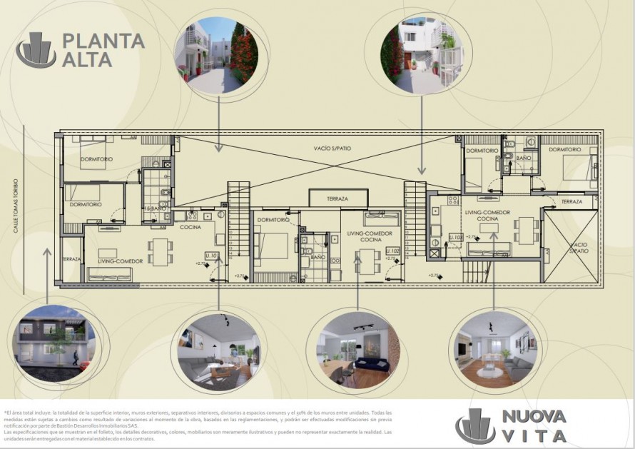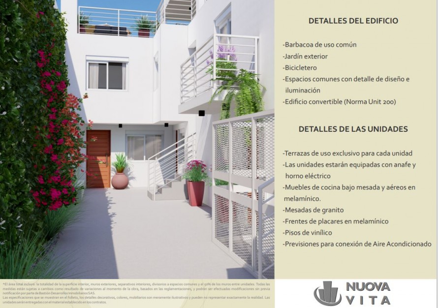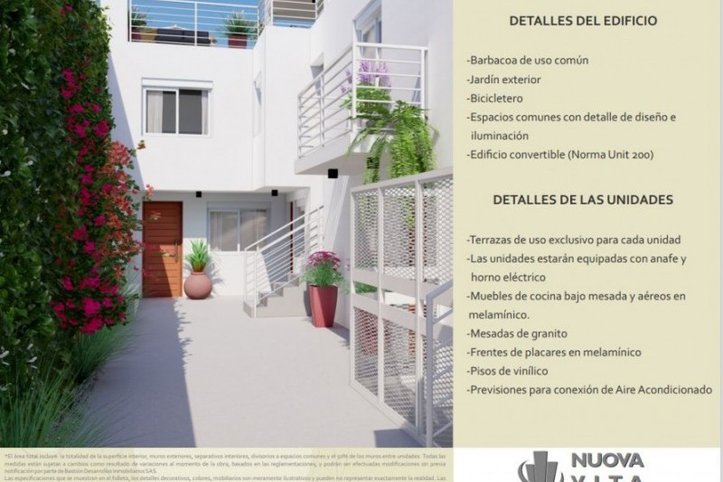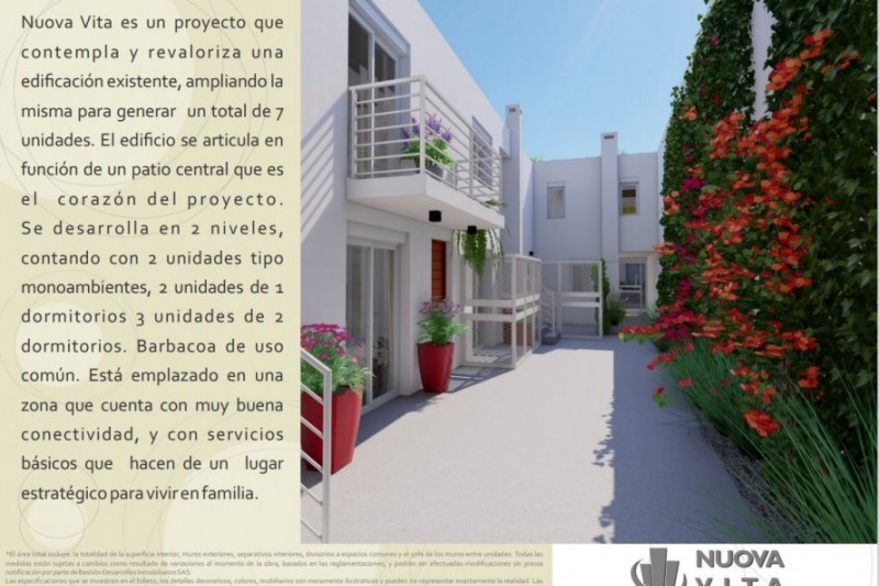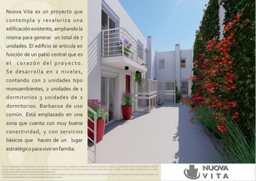 Nuova Vita es una complejo habitacional que ofrece 7 unidades con diferentes tipologías, monoambientes, 1 y 2 dormitorios, equipado con barbacoa de uso común. Jardín exterior. Bicicletero. Espacios comunes con detalle de diseño e iluminación. El edificio se articula en función de un patio central. Se desarrolla en 2 niveles.