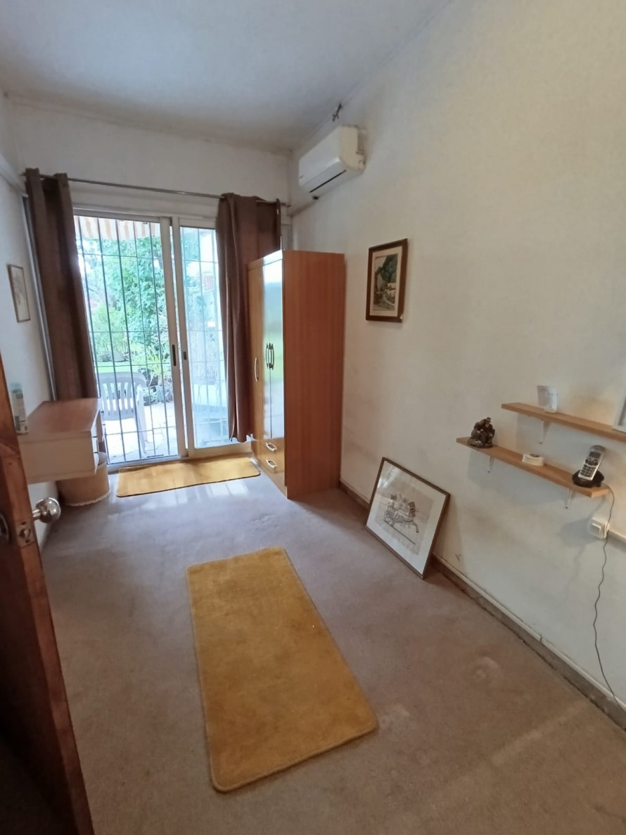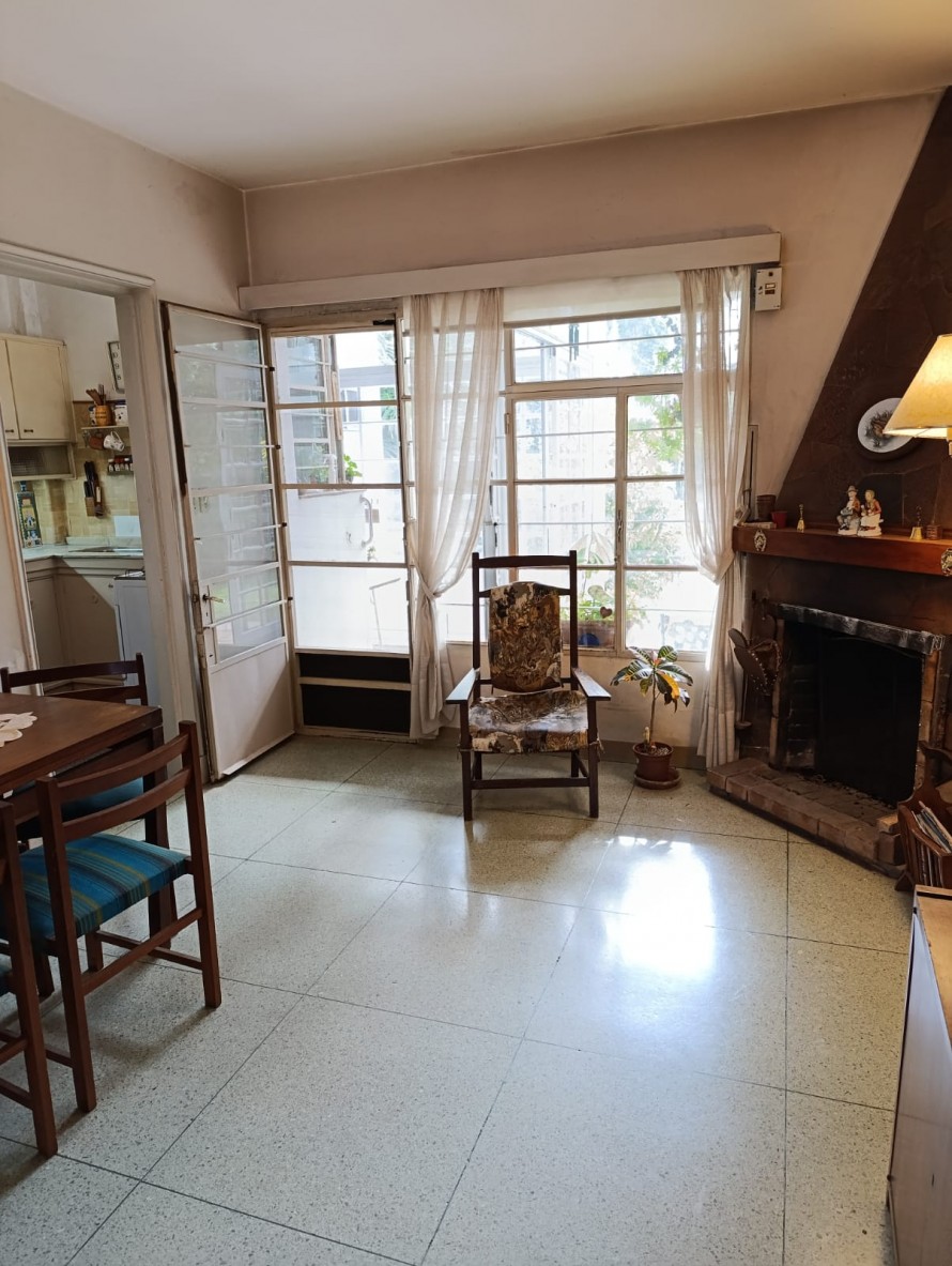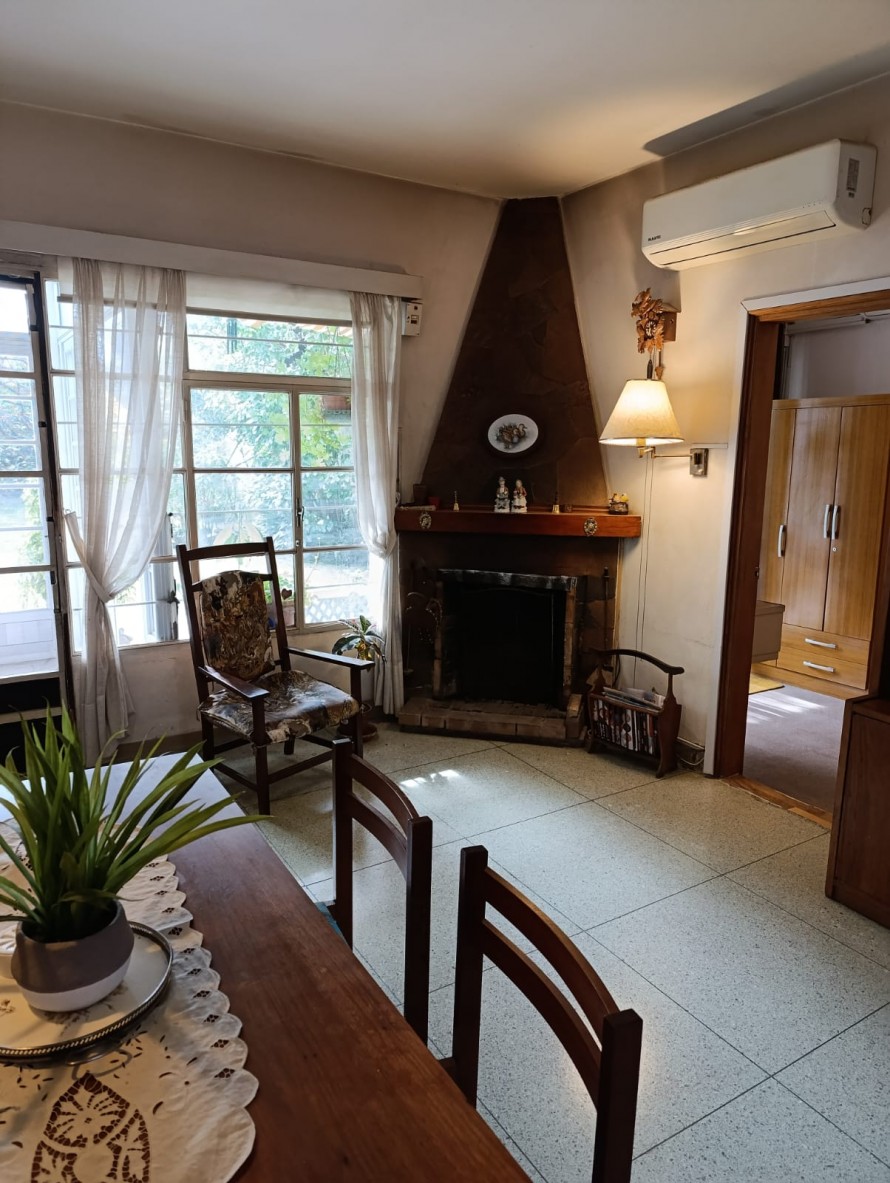 Cuenta con estar al frente con amplios ventanales, comedor con estufa a leña y salida directa al fondo. La cocina es definida, con buen espacio de almacenamiento, placares sobre y bajo mesada. En planta baja también se encuentra un baño completo y el garaje, actualmente acondicionado como dormitorio.
