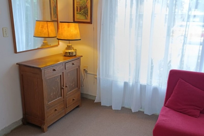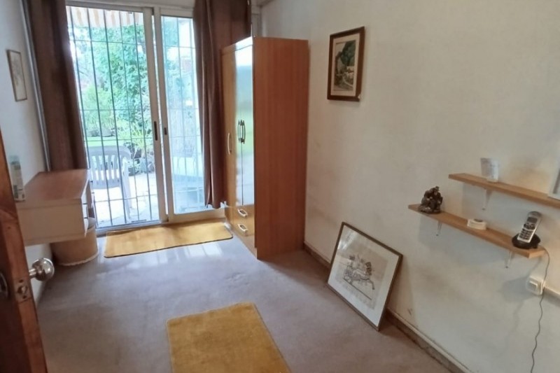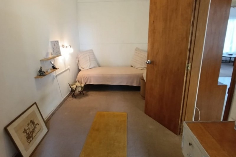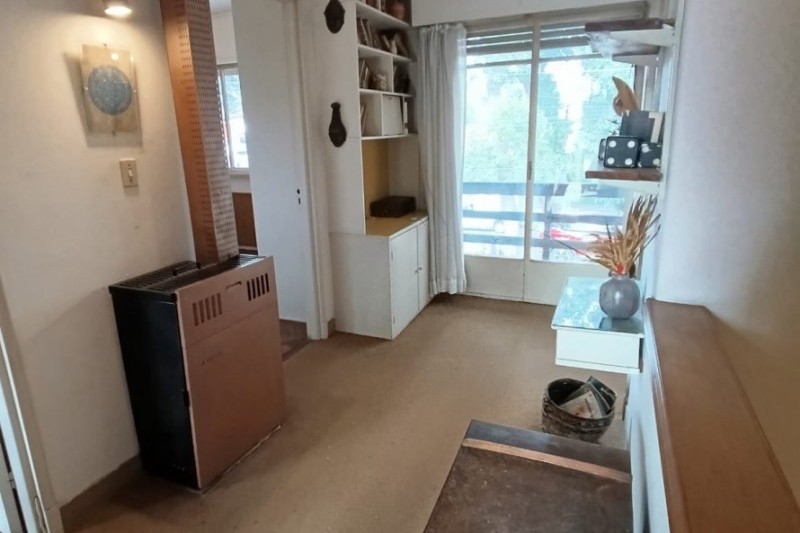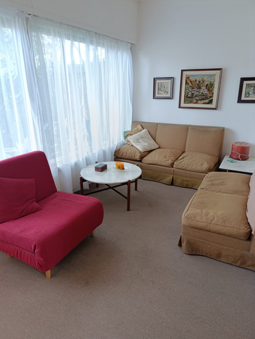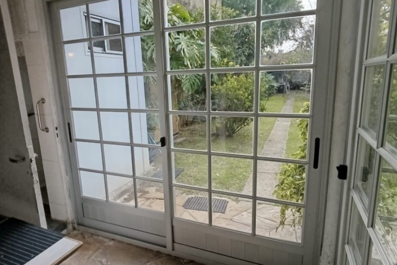 Cuenta con estar al frente con amplios ventanales, comedor con estufa a leña y salida directa al fondo. La cocina es definida, con buen espacio de almacenamiento, placares sobre y bajo mesada. En planta baja también se encuentra un baño completo y el garaje, actualmente acondicionado como dormitorio.