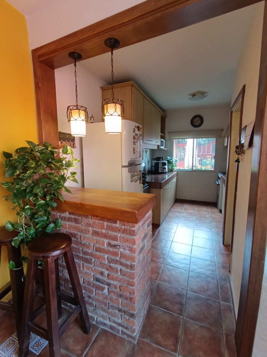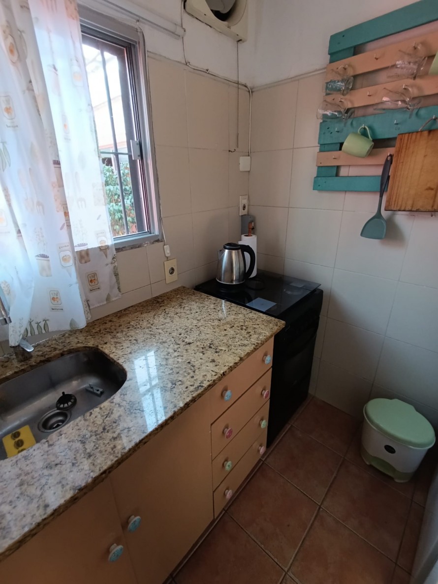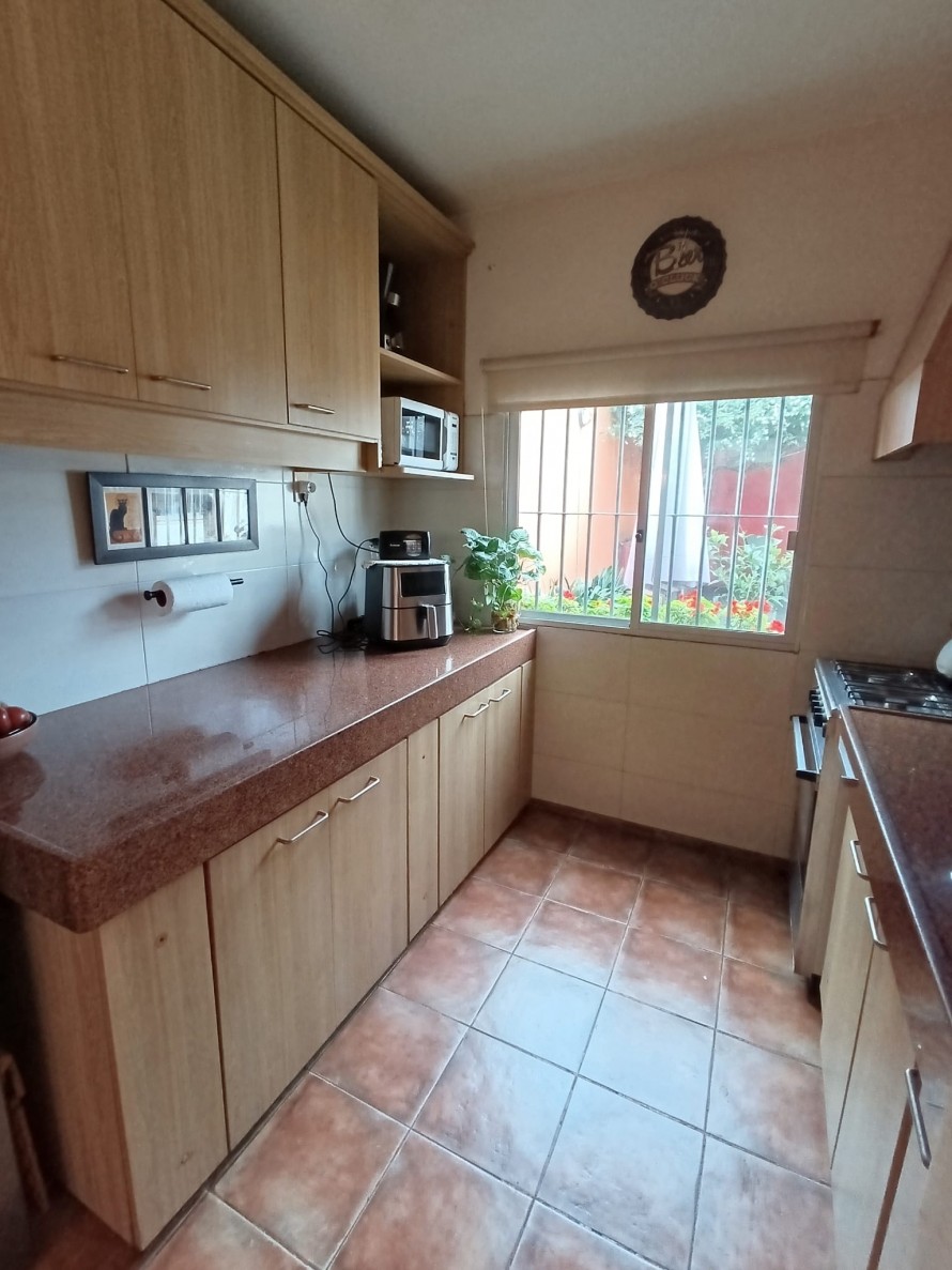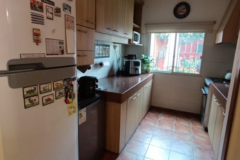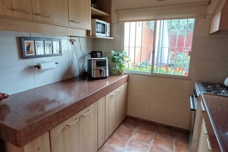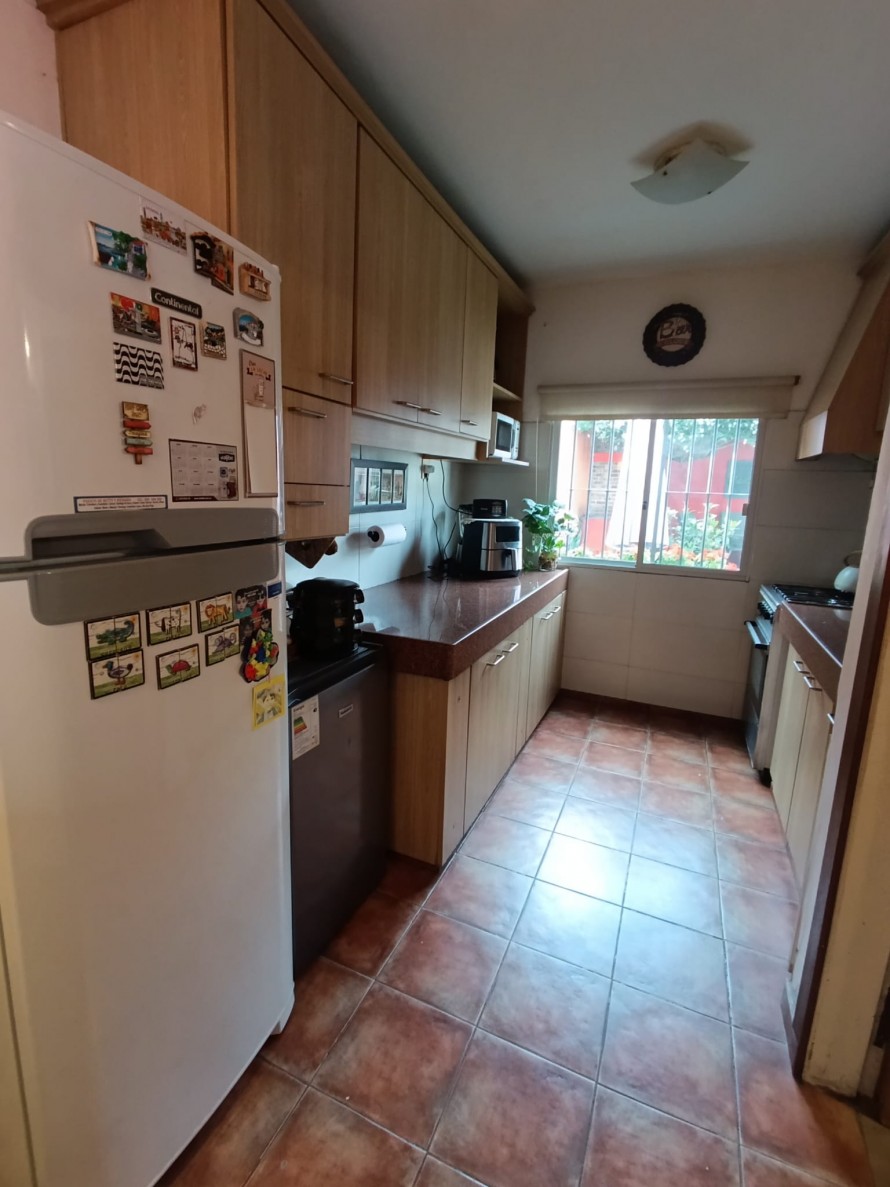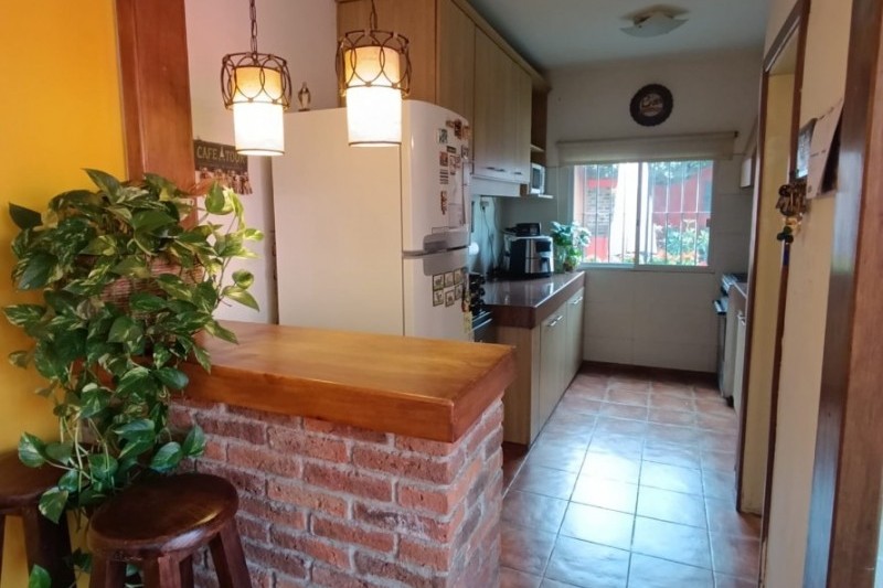 Cocina semi integrada al comedor mediante barra desayunadora, equipada con placares sobre y bajo mesada de buena capacidad.