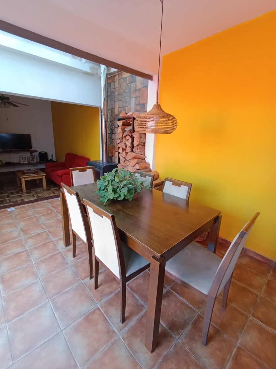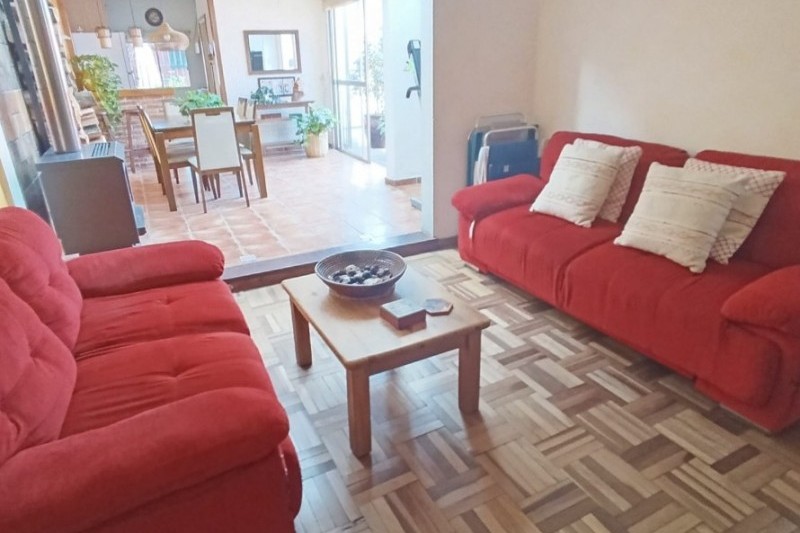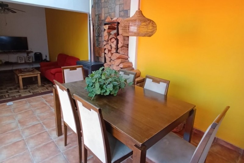 Doble acceso a living comedor de gran tamaño, con estufa de alto rendimiento, luz cenital y puertas-ventana hacia el fondo.