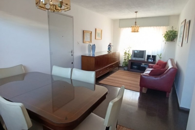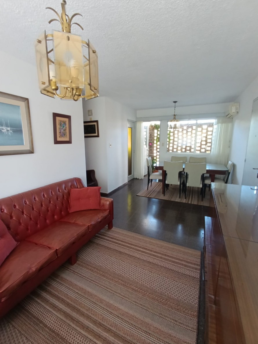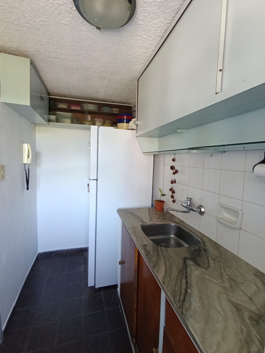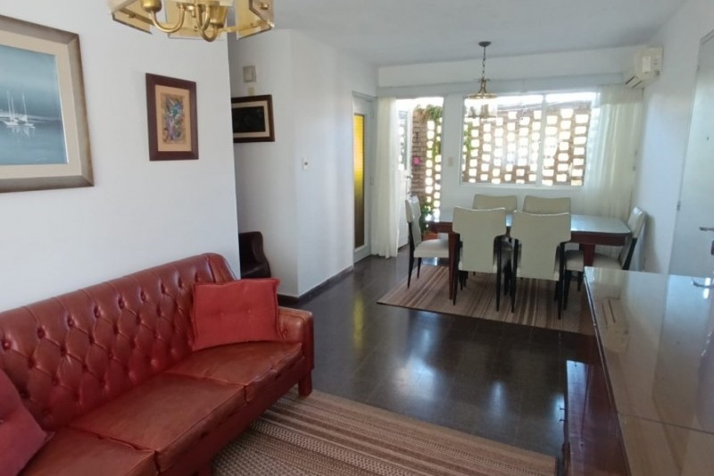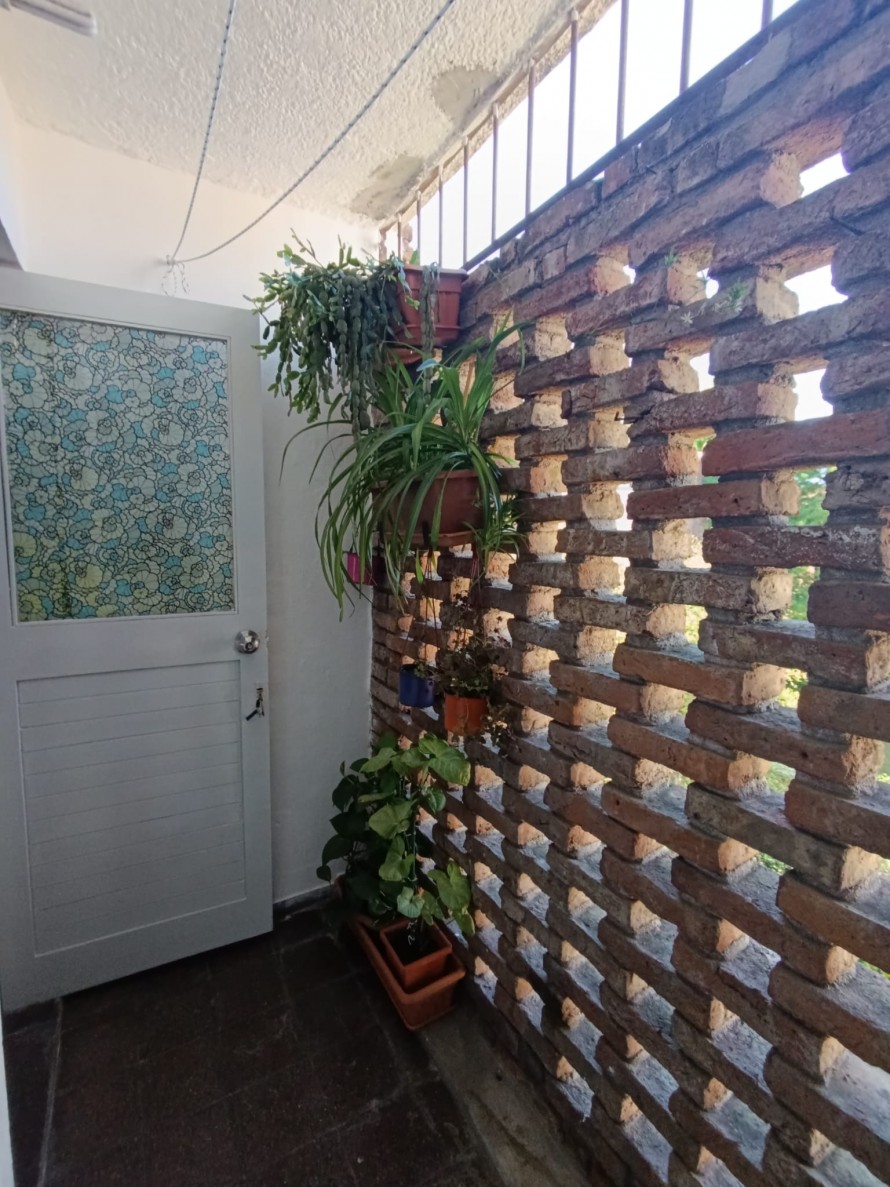 Amplio living comedor equipado con aire acondicionado, cocina definida con placares alto y bajo mesada y una terraza lavadero cerrada con conexión para lavarropas.